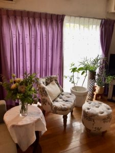 このように南側の引き違い窓にパープルのカーテンと草花柄のレースカーテンをコーディネートしましたが、南から燦々と照らす太陽の光にも美しく調和し、お庭の草花やインテリアフラワーも生き生き育つ環境が完成しました。
