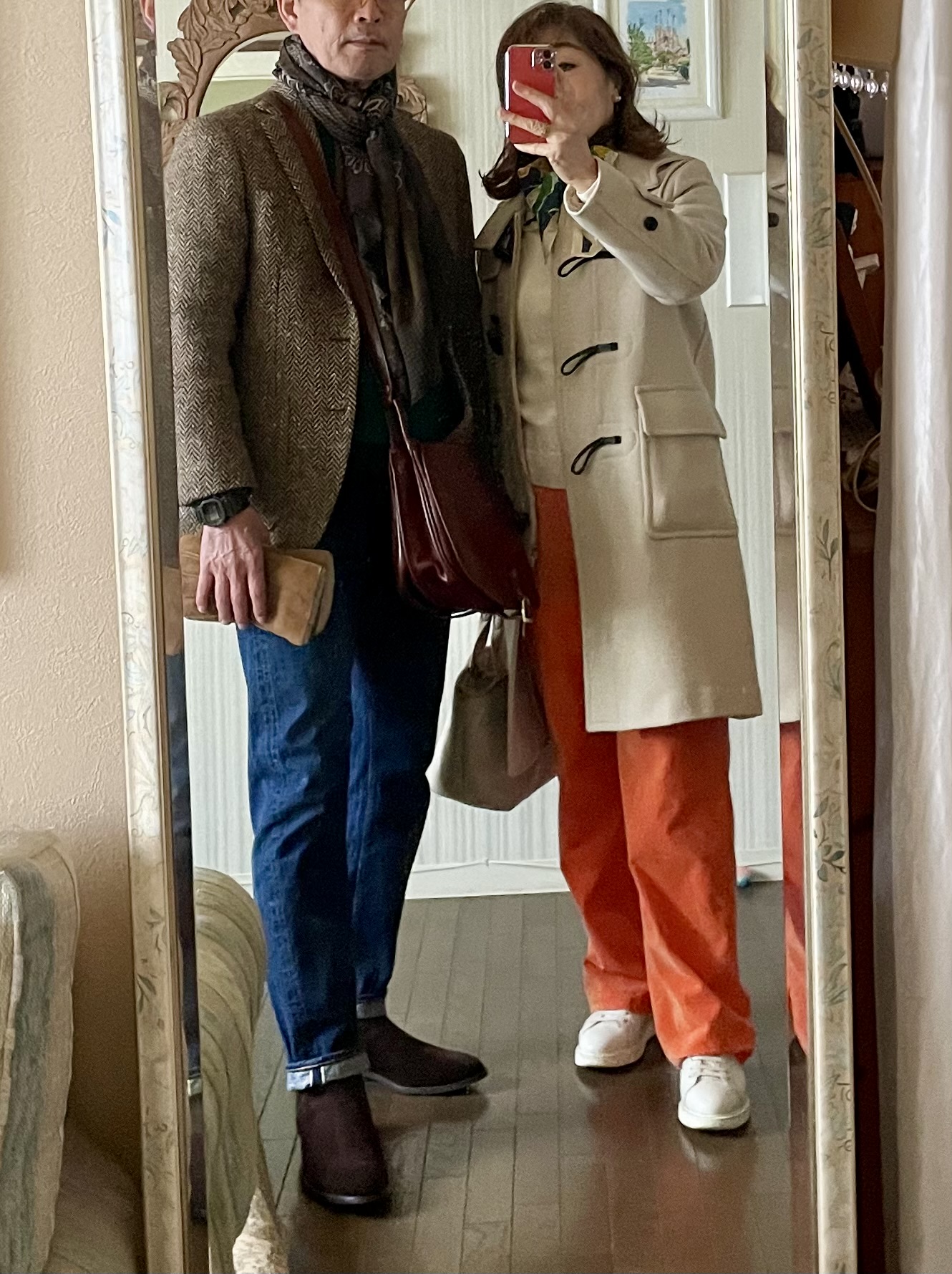 60代夫婦コーデ / オレンジパンツとツイードジャケットで楽しむヨーロピアンカラー