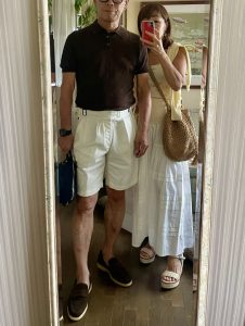 60代夫婦のパーソナルカラーを活用したコーディネート、ホワイトのボトムスでリンクコーデ