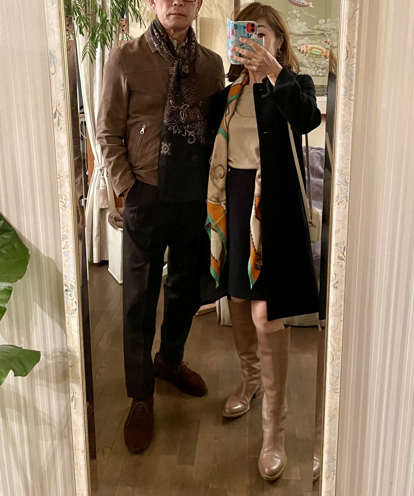 今回、夫はココアブラウン色のアウターと落ち着いた柄色のストール。