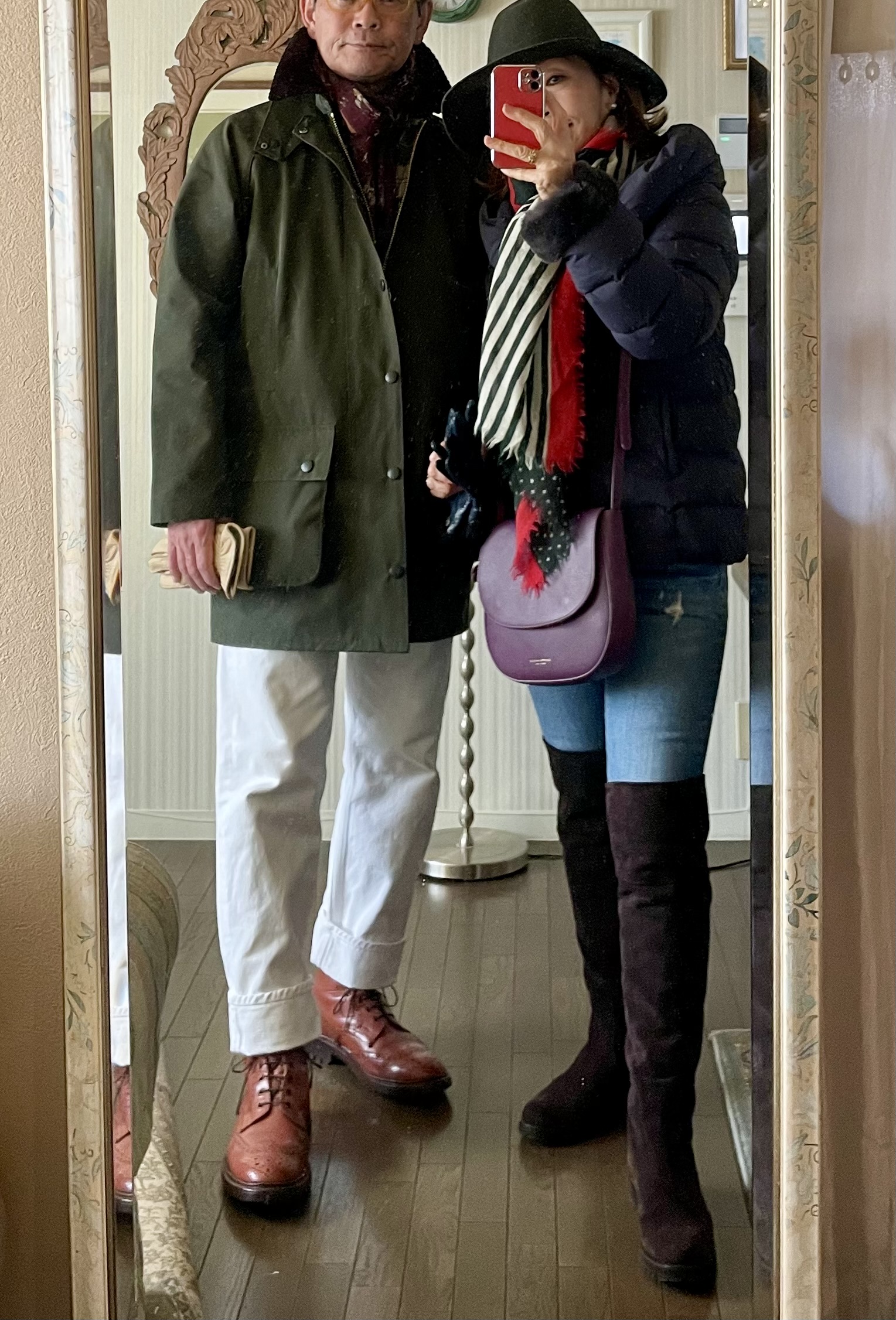 極寒の日でも上品に!60代夫婦コーデは『差し色ストール』で防寒とおしゃれの両立