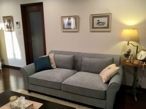 施主様の開運カラーでもあるグレイッシュなブルー系のソファーを一緒に提案。