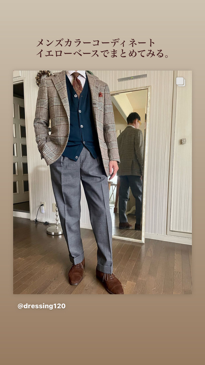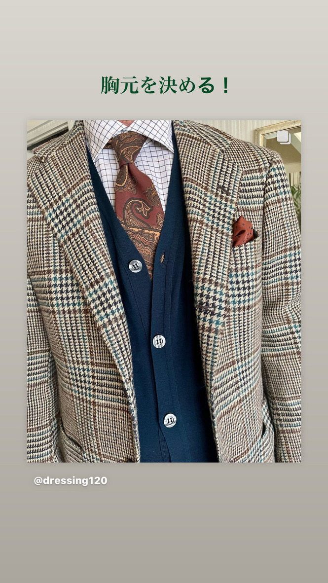 しかし、色をプラスすることで、個性が出て、一気におしゃれ度が増すのが、ジャケットとネクタイ、ベスト、ポケットチーフなどの上半身の色の組み合わせです。