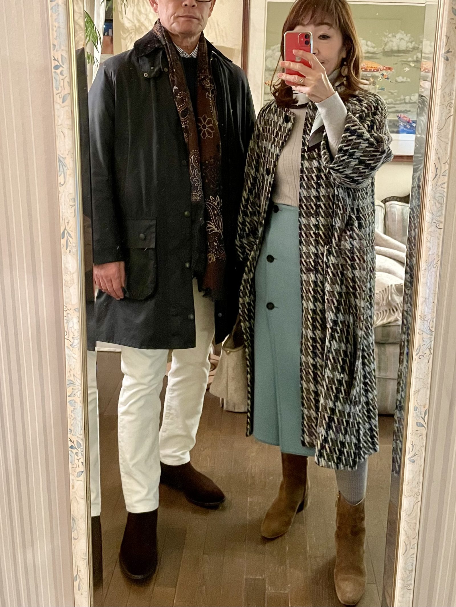 ストール・バッグ・靴など、どちらかの色をさりげなく拾うだけで夫婦コーデが完成します。