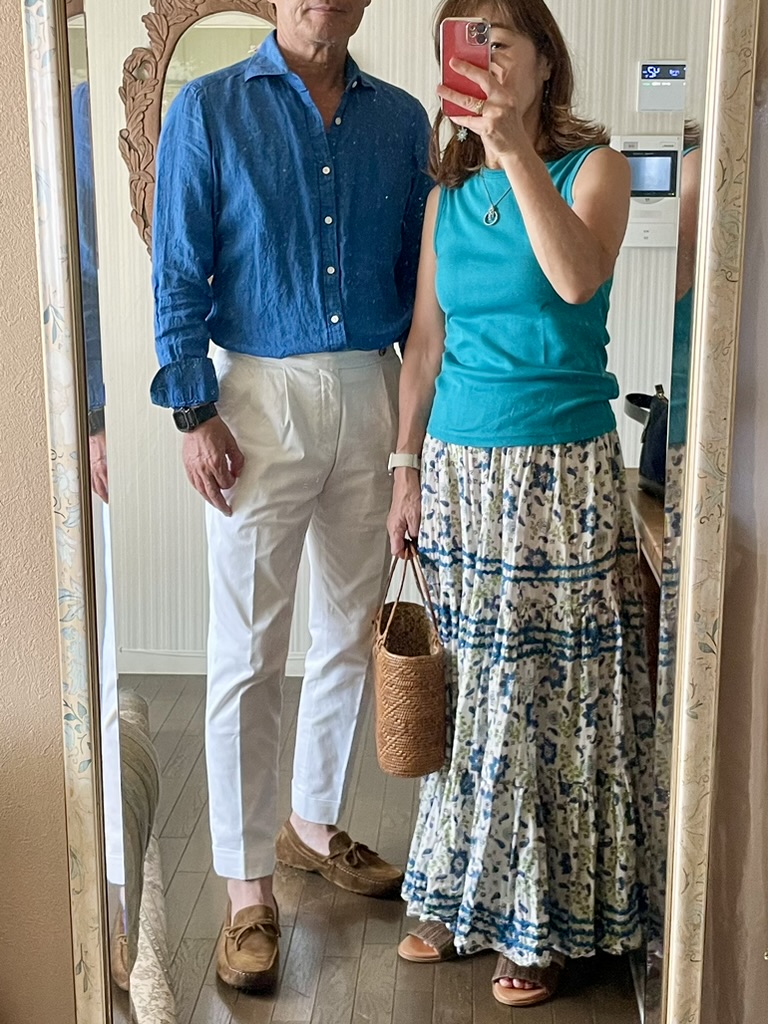 今回の夫婦コーデでは、どちらも「青」を基調にしていますが、同じ青色を選んでいるわけではありません。