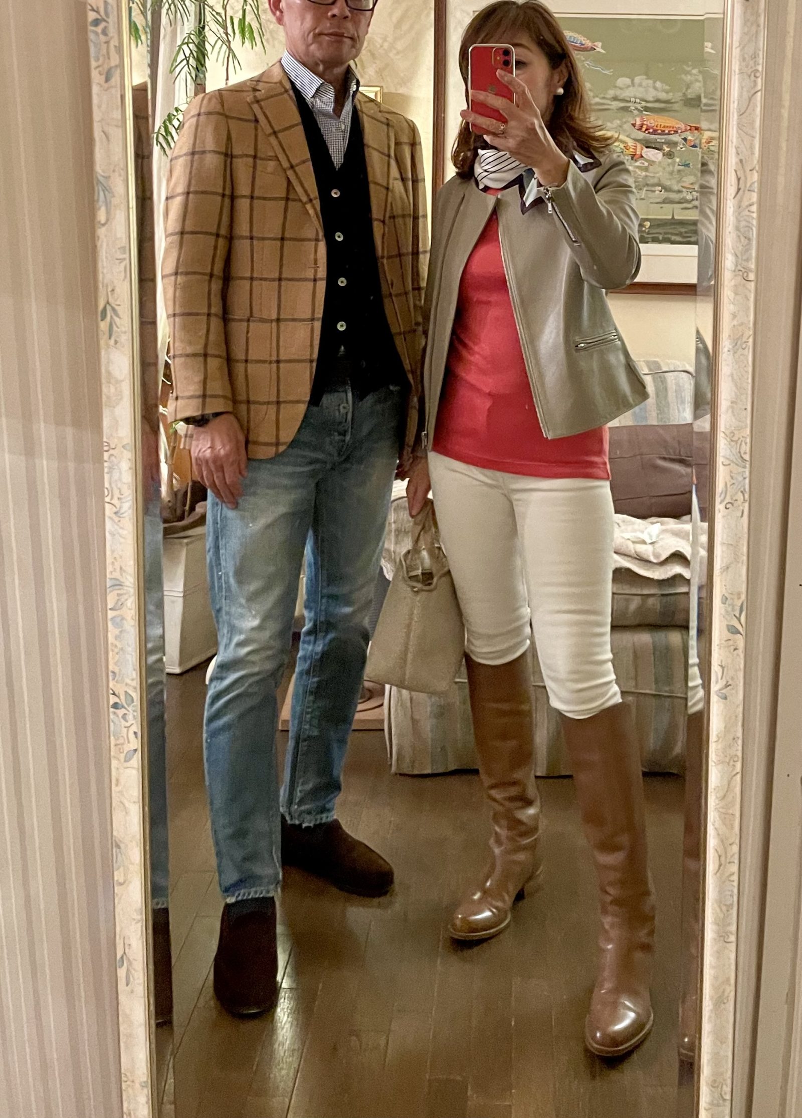 今回のコーデでは、夫はベージュチェックジャケットで温かみをリンク。
