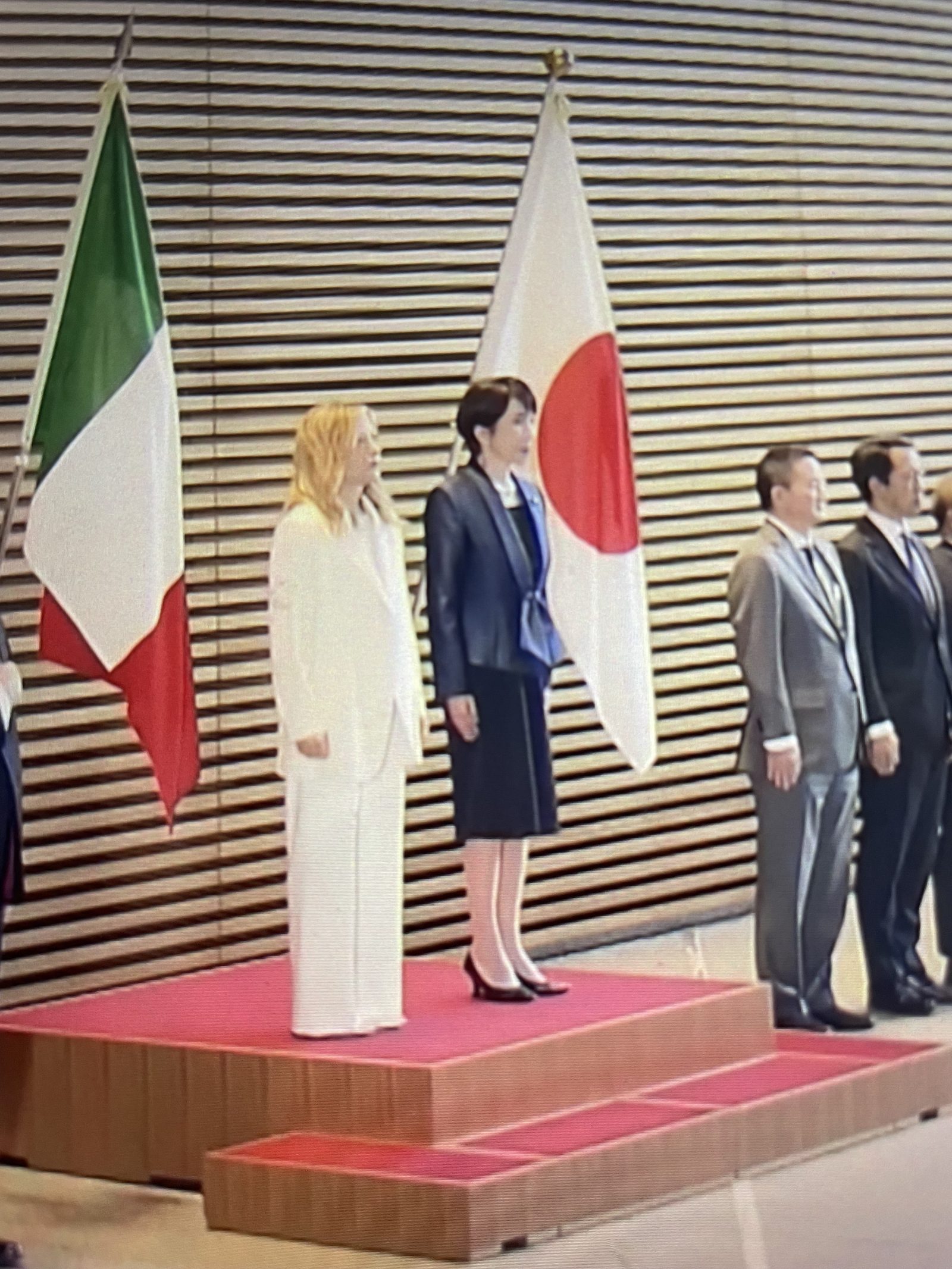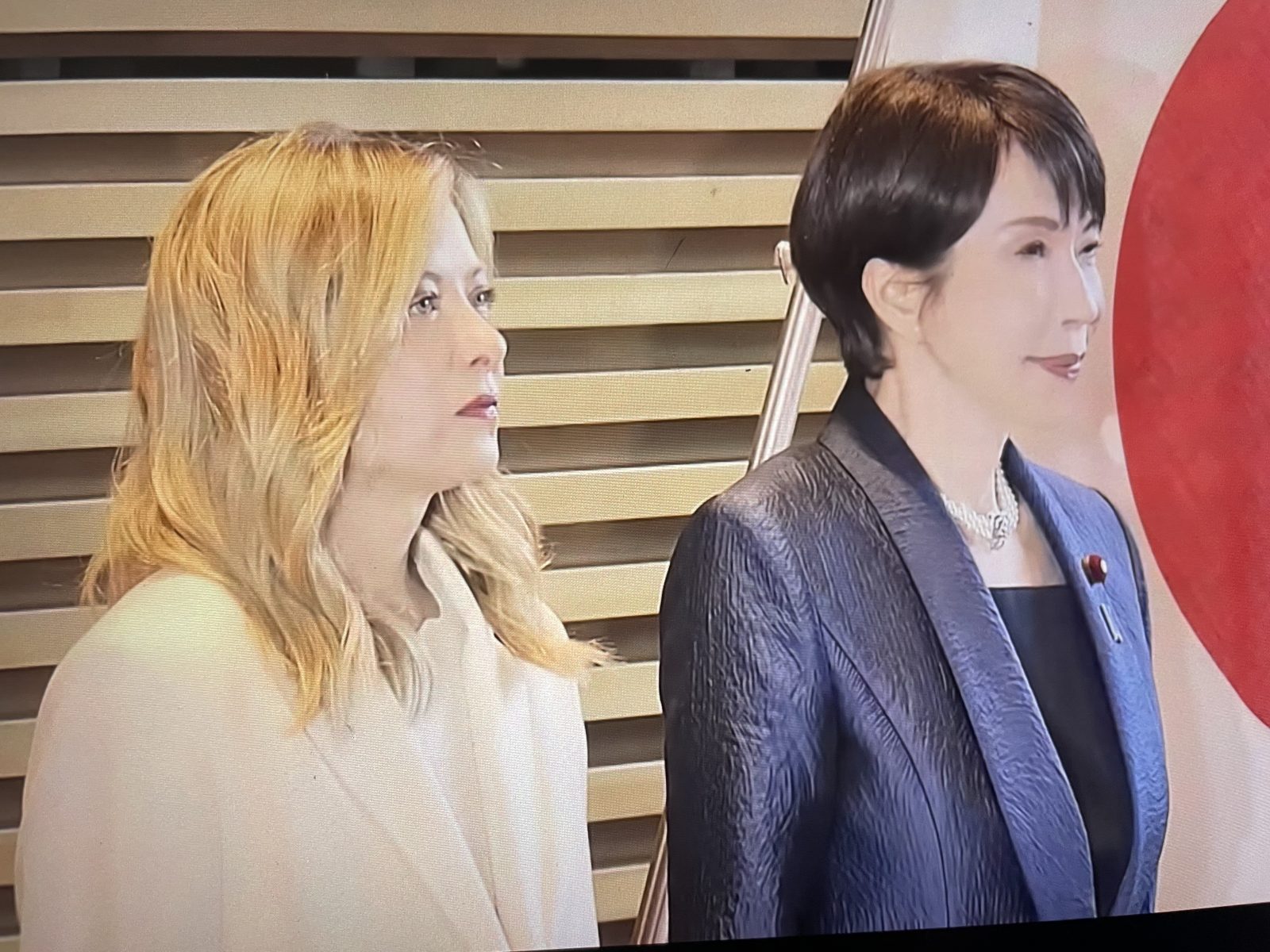 来日中のイタリア・メローニ首相は白、高市首相は青x黒。