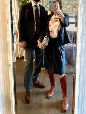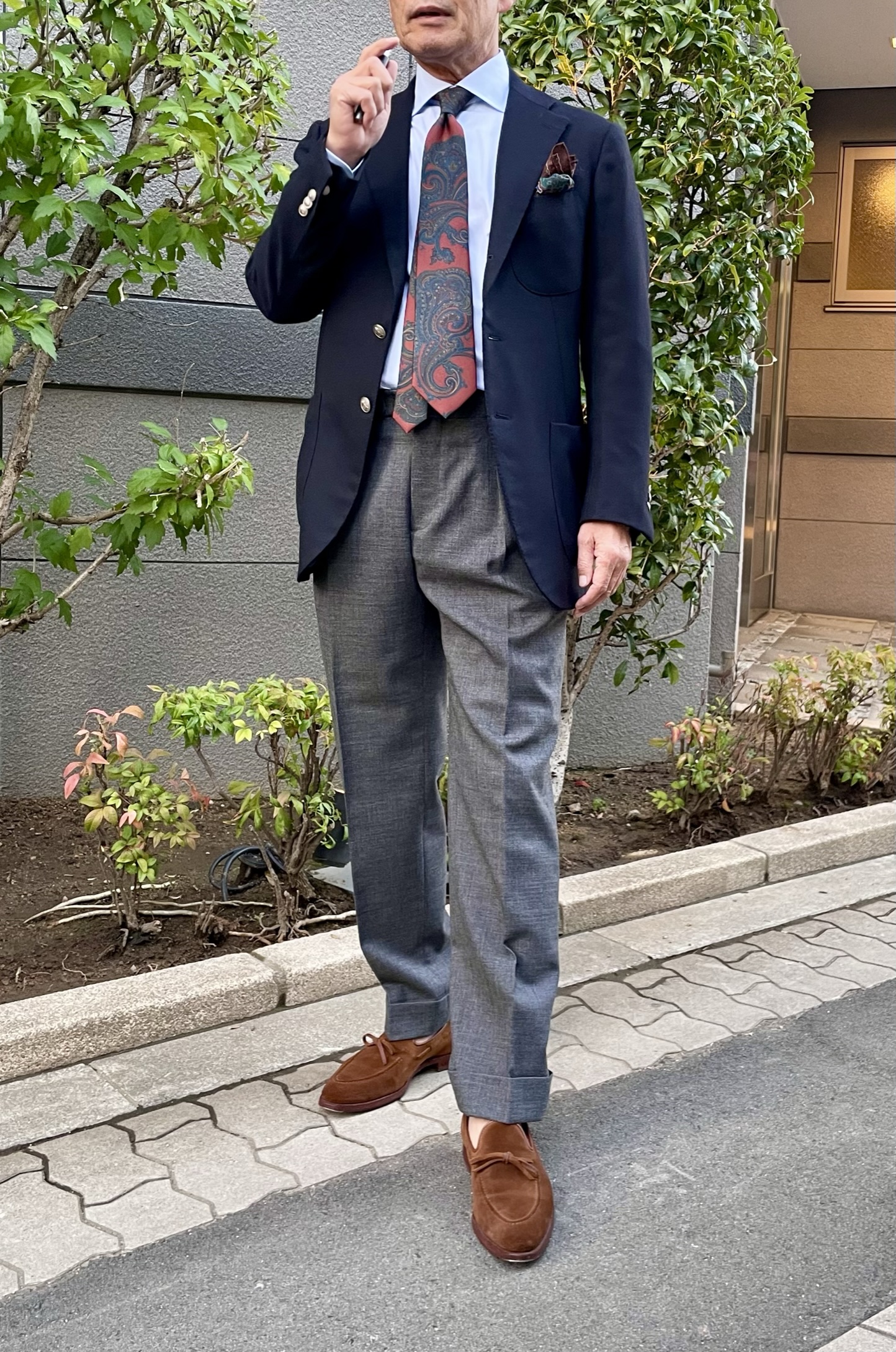 ネイビー以外にグレー✖️テラコッタブラウン配色が作るトラディショナルな装いの考え方も参考になります。