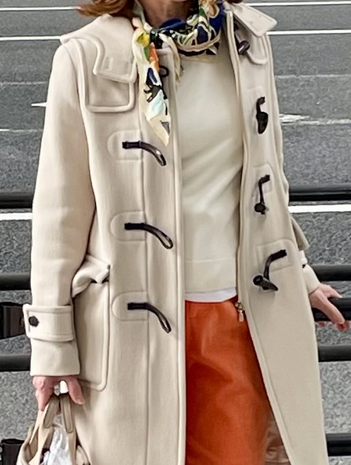 今回は、オイスターホワイトのダッフルコートとオレンジパンツを合わせた大人カジュアルコーデです。