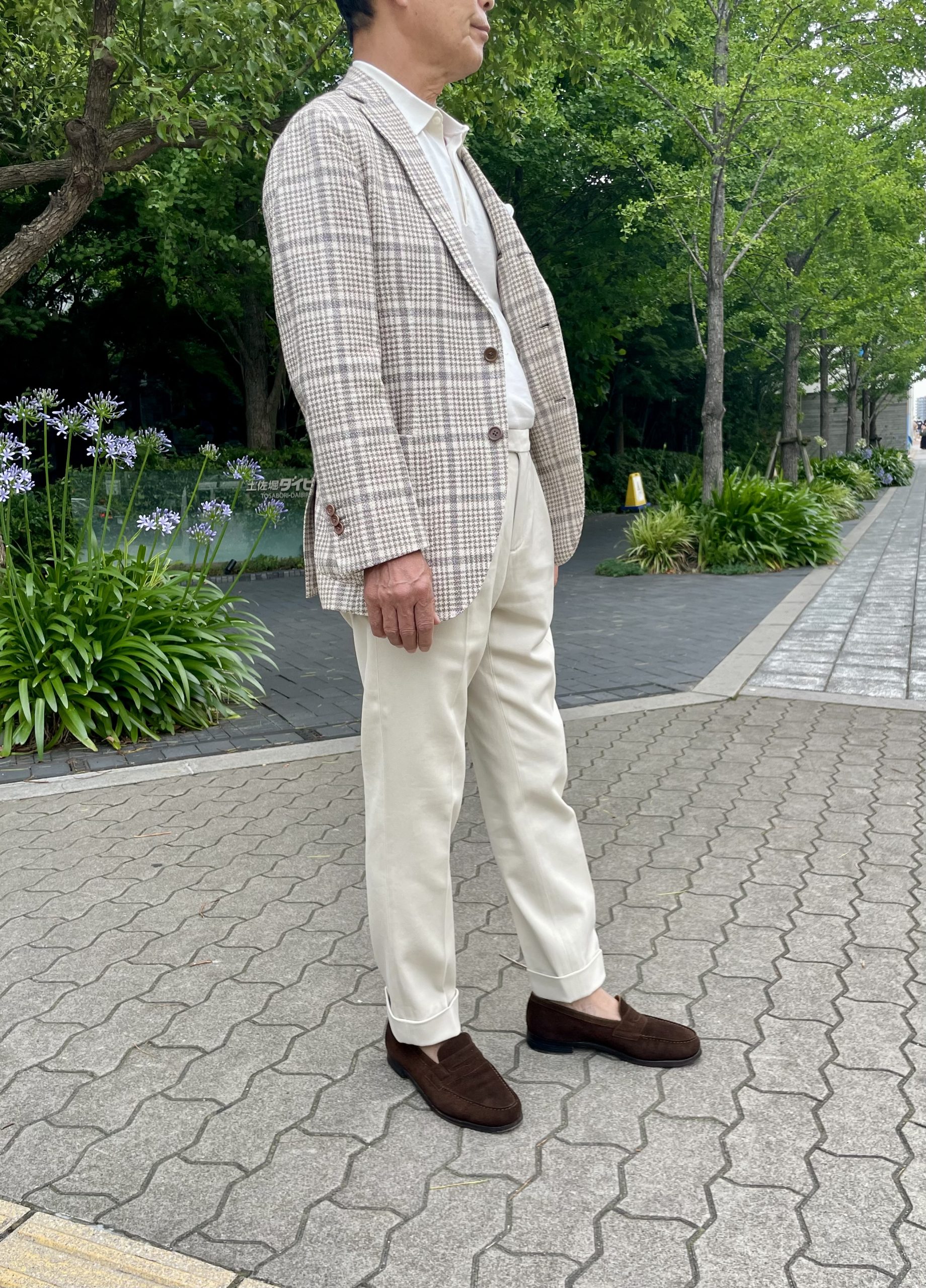 ボタンの色に合わせてシューズも焦茶を選んでいます。