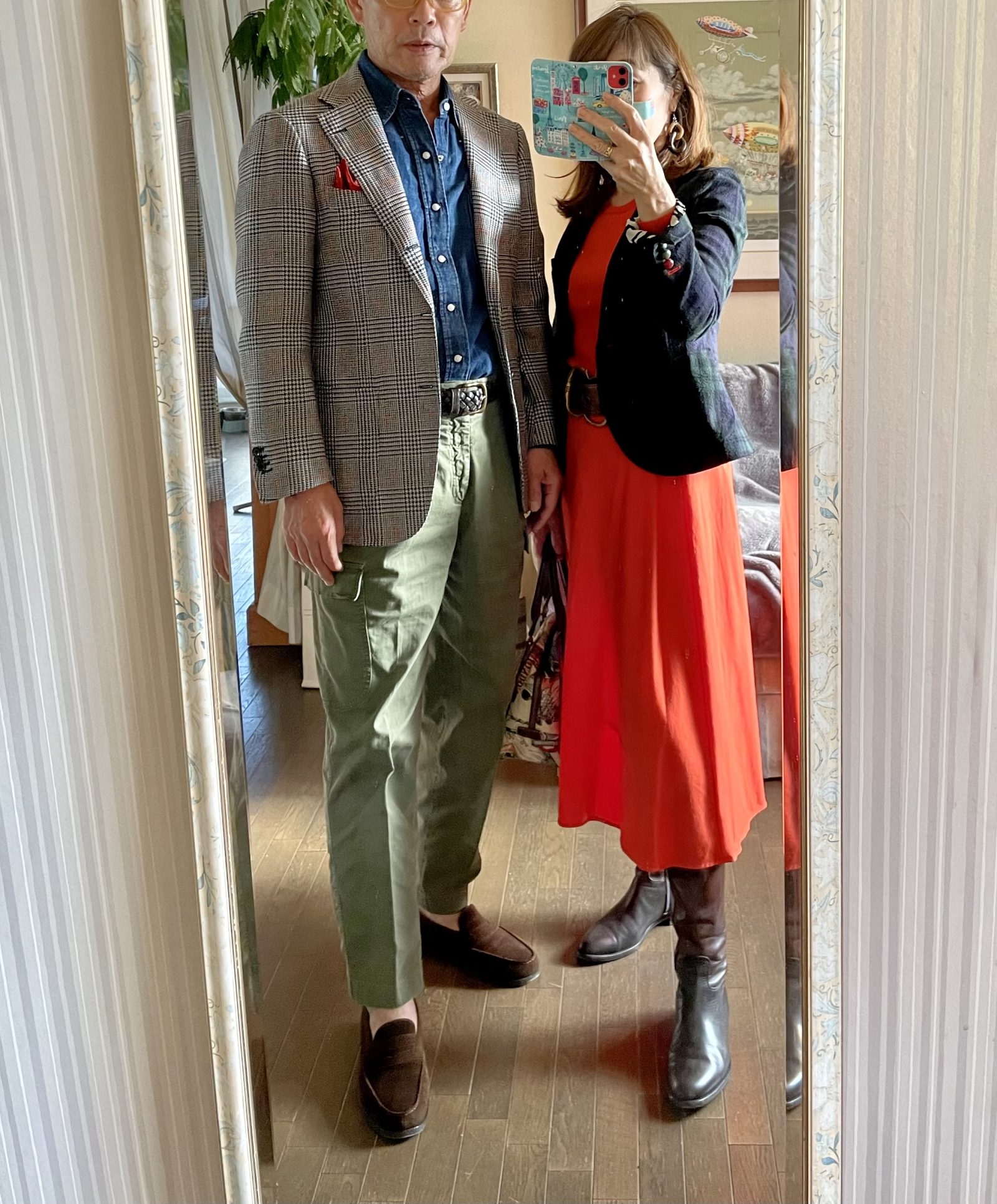 今回のコーデは、落ち着いたトラディショナルスタイルに鮮やかな色を取り入れた夫婦コーデです。