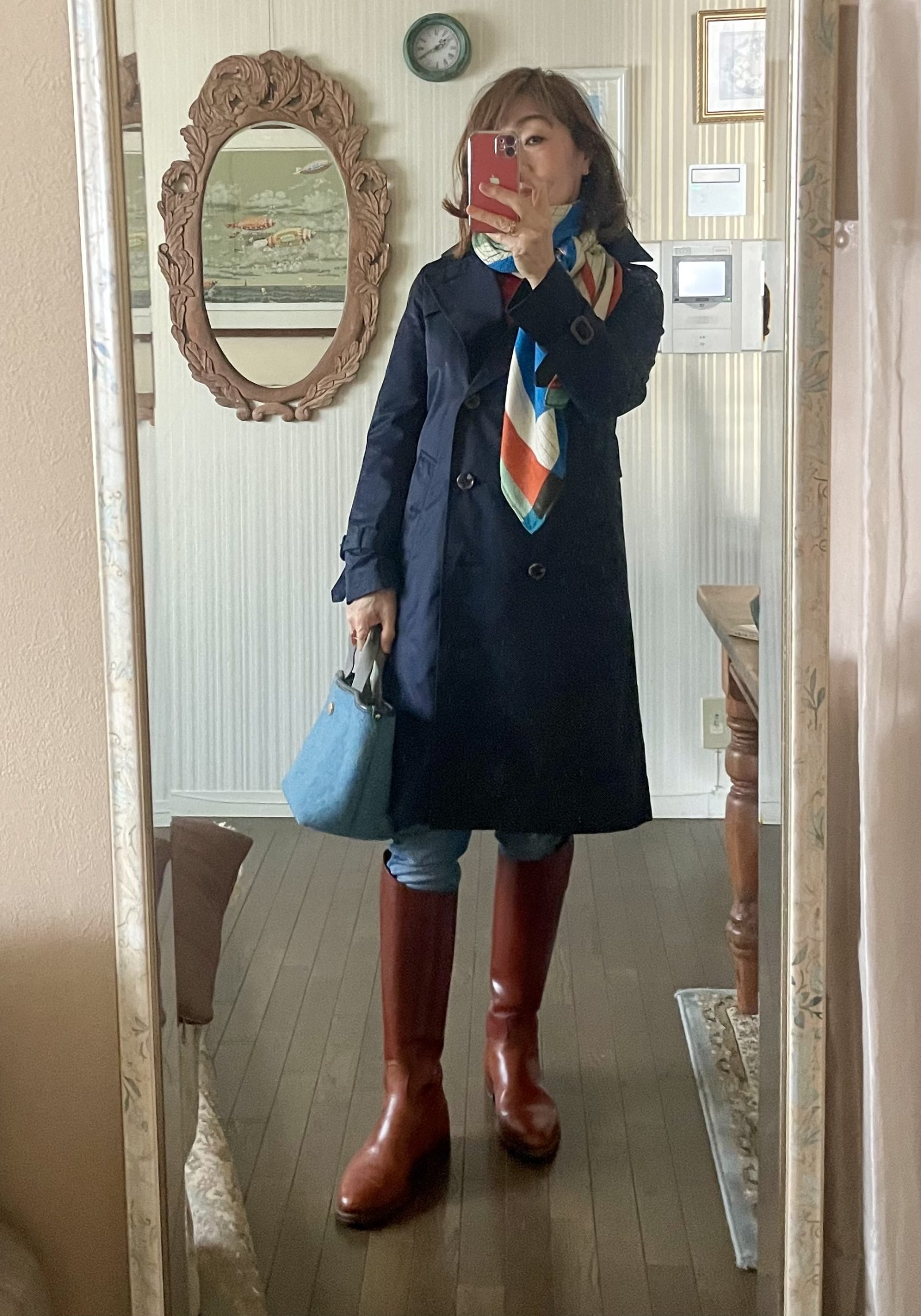 今回は、ネイビーのトレンチコート✖️ジーンズという定番に、スカーフとトマトレッドのニットで『動き』を加えました。