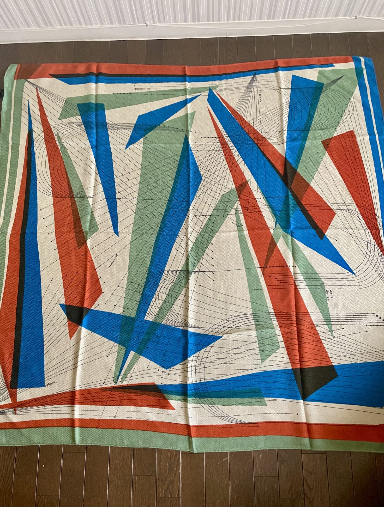 今回取り入れたのは、ブルー・グリーン・オレンジ・赤を効かせたアールデコ調の大判スカーフ。