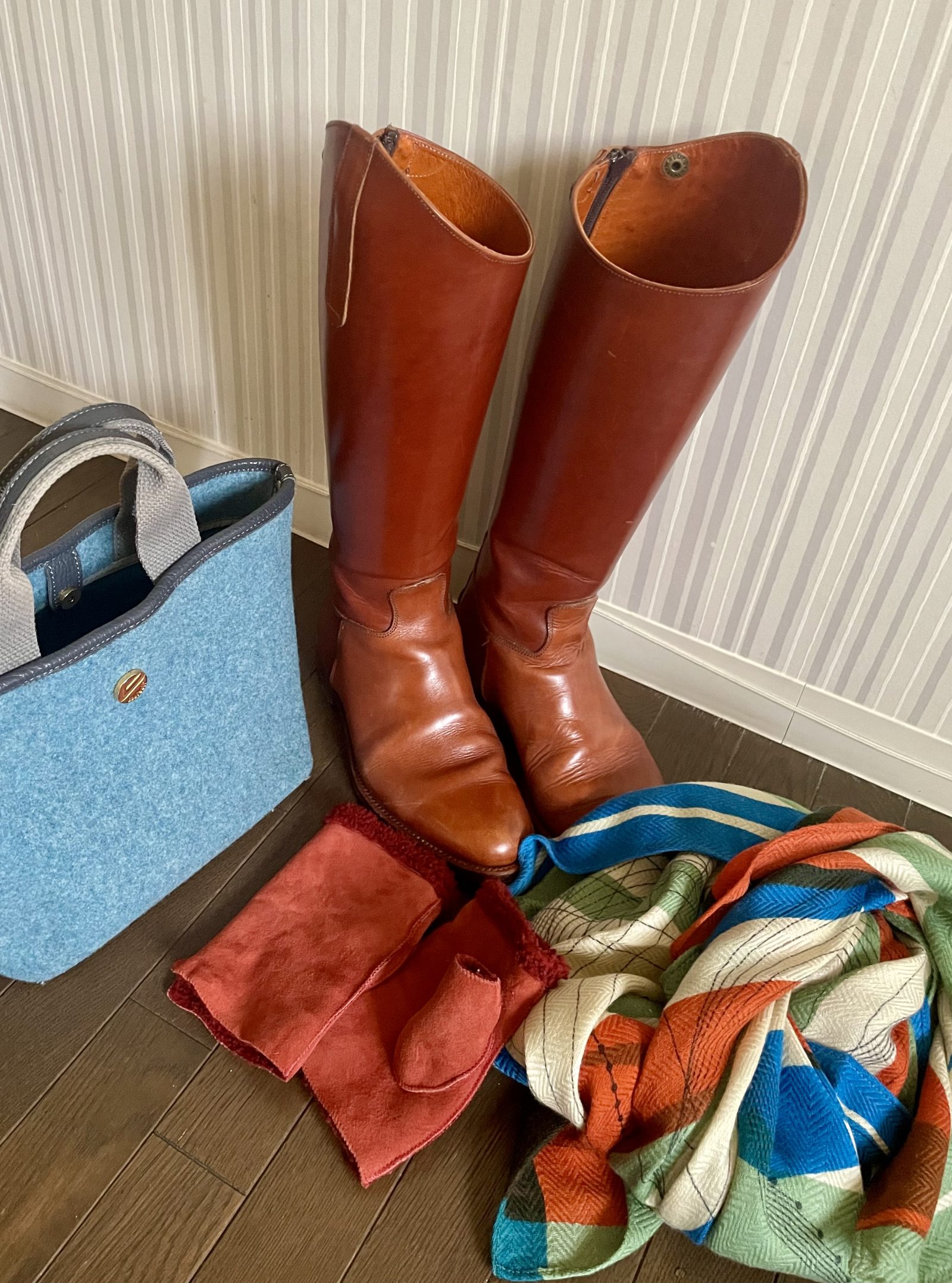 ブーツやバッグなども同系色で揃えることで、補色のスカーフも『派手』ではなく『洗練』に見せられます。